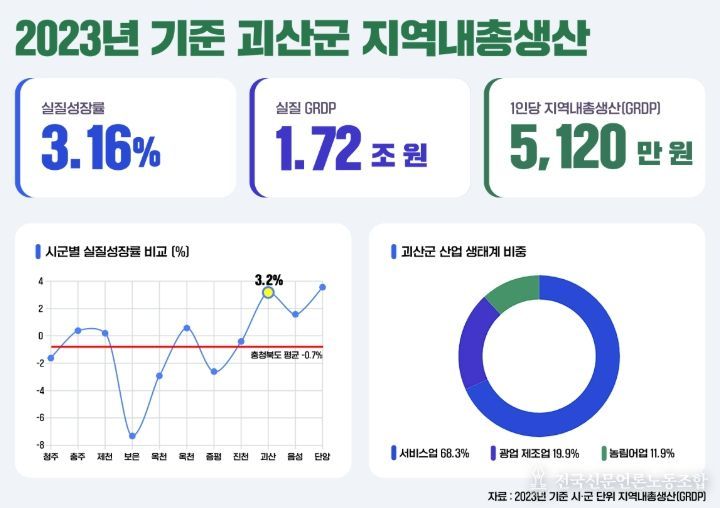 주민 체감 지표인 1인당 GRDP도 상승했다. 2023년 괴산군 1인당 GRDP는 5,120만 원으로 집계돼 음성·진천·단양군에 이어 도내 네 번째로 높았다.