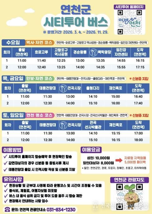 전국신문언론노동조합 김성길 기자 | 연천군이 오는 3월 4일부터 ‘2026년 연천 시티투어 버스’를 재운행한다. 운영 기간은 11월 29일까지다.