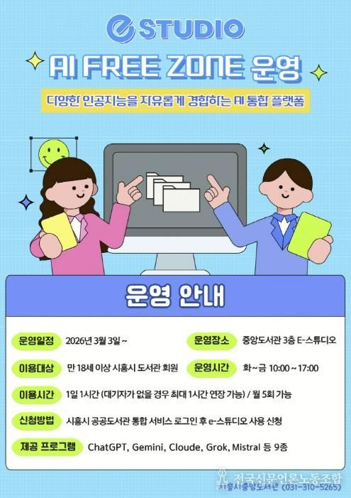 전국신문언론노동조합 김성길 기자 | 시흥시중앙도서관은 시민들의 인공지능(AI) 활용 역량 강화를 위해 시 정보통신과와 협업해 도서관 3층 e-스튜디오에 ‘인공지능(AI) 프리 존(Free Zone)’을 구축하고, 오는 3월 3일부터 본격 운영에 들어간다.