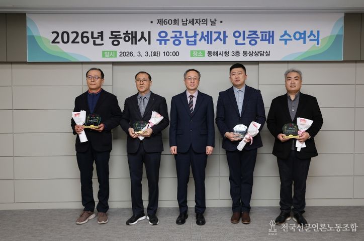전국신문언론노동조합 강찬희 기자 | 동해시는 3월 3일 '제60회 납세자의 날'을 맞아 시청 통상상담실에서 유공납세자 인증패 수여식을 열고 성실납세자들에게 감사의 뜻을 전했다.
