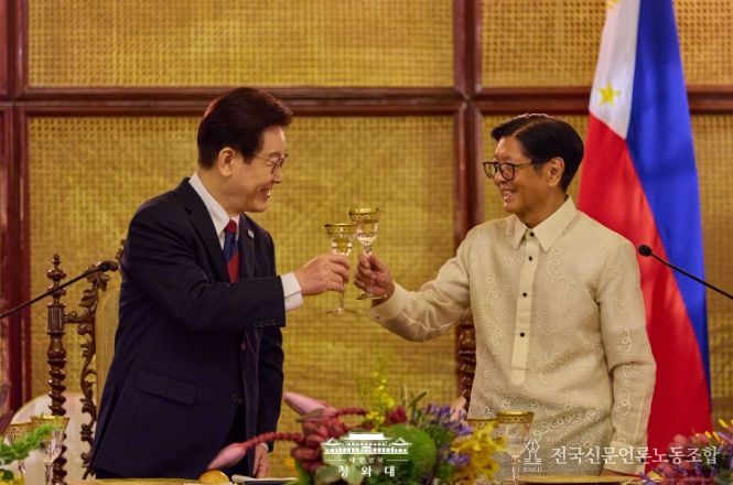 전국신문언론노동조합 강찬희 기자 | 필리핀을 국빈 방문 중인 이재명 대통령 부부는 3일 저녁, 페르디난도 로무알데즈 마르코스 주니어 대통령이 필리핀 말라카냥궁에서 주최한 만찬에 참석했다.