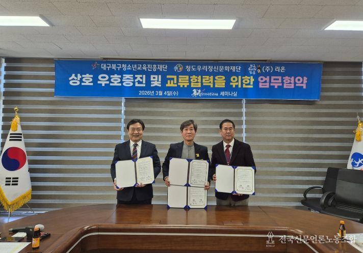 전국신문언론노동조합 강찬희 기자 | 청도우리정신문화재단(대표이사 기화서)은 지난 3월 4일 화랑정신을 이어가는 청도신화랑풍류마을에서 (재)대구북구청소년교육진흥재단(상임이사 이복우), 한국코미디타운 운영주체 ㈜리온(대표 김미숙)과 상호 우호 증진 및 교류 협력을 위한 업무협약(MOU)을 체결했다.