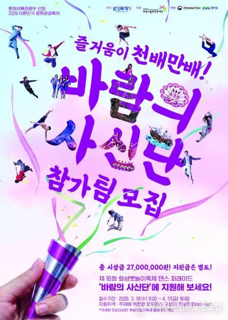 전국신문언론노동조합 김성길 기자 | (재)화성시문화관광재단은 제16회 화성 뱃놀이 축제의 주인공이 될 ‘바람의 사신단 댄스 퍼레이드‘경연 참가팀을 모집한다.