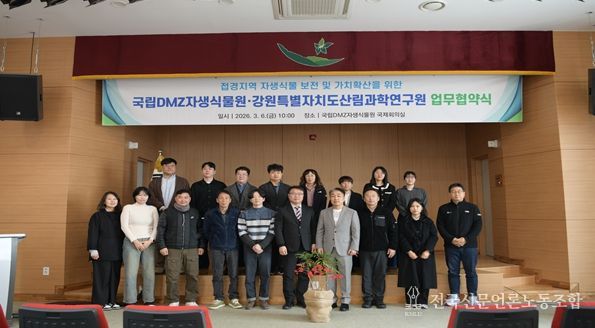 전국신문언론노동조합 강찬희 기자 | 강원특별자치도 산림과학연구원(원장 채병문)은 3월 6일 국립DMZ자생식물원 국제회의실에서 DMZ 및 접경지역 자생식물의 현지 외 보전과 육성을 위한 협력 강화를 위해 국립DMZ자생식물원(원장 이봉우)과 업무협약을 체결했다.