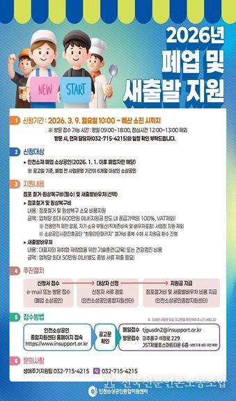전국신문언론노동조합 강찬희 기자 | 인천광역시는 고환율·고물가 등 경영 여건 악화로 폐업한 소상공인의 부담을 완화하고 성공적인 재취업과 재창업을 지원하기 위해 ‘폐업 및 새출발 지원’을 추진한다고 밝혔다.