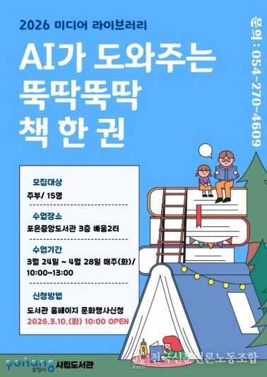전국신문언론노동조합 강찬희 기자 | 포항시립포은중앙도서관은 오는 24일부터 4월 28일까지 매주 화요일, 포은중앙도서관 배움2터에서 ‘2026 상반기 별찌인문교실’과 ‘미디어라이브러리’ 수업을 운영한다.