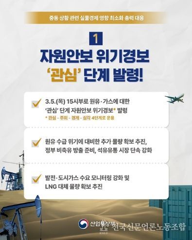 - 3.5.(목) 15시부로 원유·가스에 대한 '관심' 단계 자원안보 위기경보* 발령