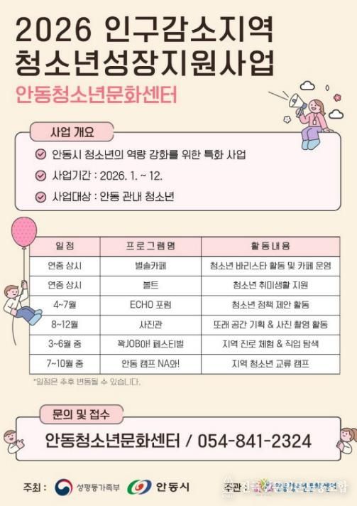 전국신문언론노동조합 강찬희 기자 | 성평등가족부와 안동시가 지원하고 안동청소년문화센터가 주관하는 ‘2026 인구감소지역 청소년성장지원’ 사업이 지난해에 이어 2년 연속 운영된다.