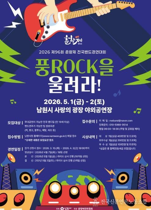 전국신문언론노동조합 강찬희 기자 | 남원시가 오는 4월 30일부터 5월 6일까지 개최되는 대한민국 대표 전통 축제인 ‘제96회 춘향제’를 맞아, 전국의 실력파 뮤지션들이 한자리에 모이는 밴드 경연대회 ‘풍ROCK을 울려라!’를 개최한다고 밝혔다.
