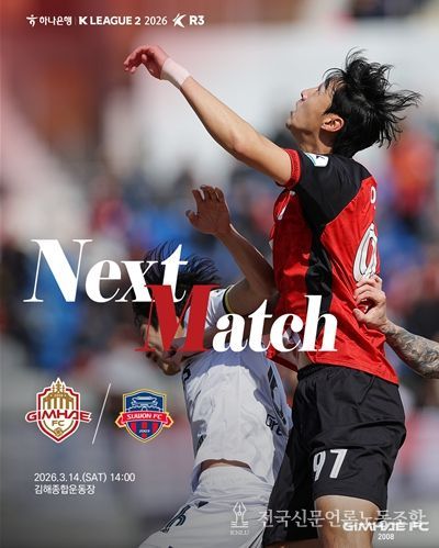 전국신문언론노동조합 강찬희 기자 | 김해FC가 오는 14일 오후 2시 김해종합운동장에서 수원FC(‘수원’)를 상대로 ‘하나은행 K리그2 2026’ 3라운드 홈 경기를 치른다.