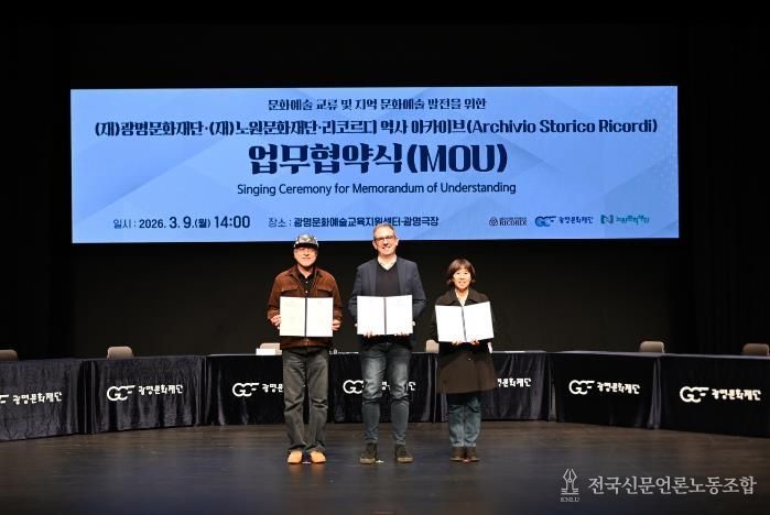 전국신문언론노동조합 김성길 기자 | (재)광명문화재단은 3월 9일 오후 2시 광명극장에서 (재)노원문화재단, 리코르디 역사 아카이브(Archivio Storico Ricordi)(이하 리코르디)와 ‘문화예술 교류 및 지역 문화예술 발전’을 위한 업무협약(MOU)을 체결했다고 밝혔다.