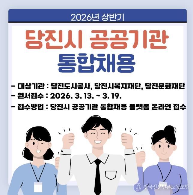 전국신문언론노동조합 강찬희 기자 | 당진도시공사는 시민이 신뢰하고 지속가능한 당진 미래를 선도하는 공기업으로 도약하기 위해 2026년 제3회 일반직 직원 공개채용을 실시한다고 11일 밝혔다.