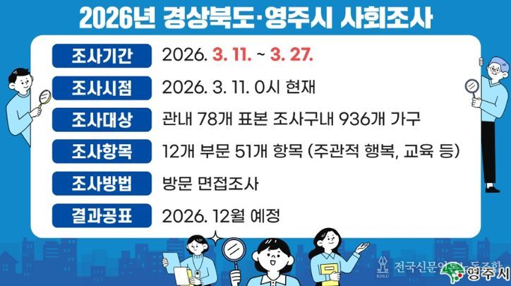 조사 기간은 3월 11일부터 27일까지 17일간이며, 표본으로 선정된 영주시 내 936가구의 가구주와 만 15세 이상 가구원을 대상으로 진행된다.