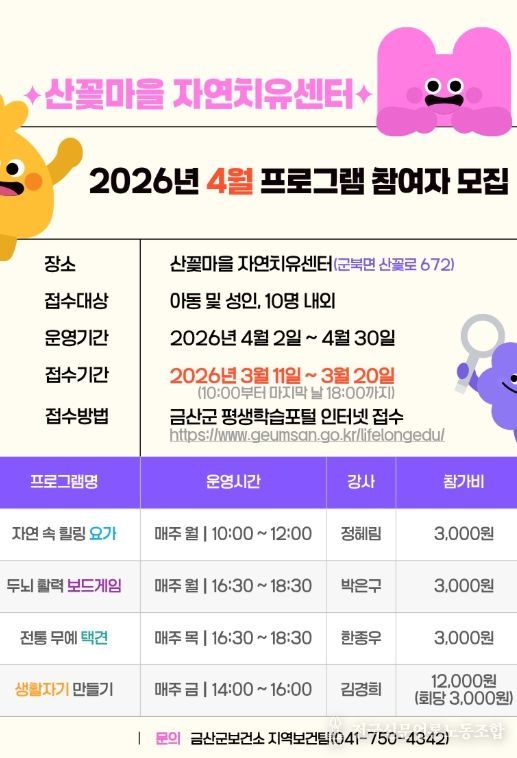전국신문언론노동조합 강찬희 기자 | 금산군은 지역 주민의 건강 증진과 여가 활성화를 위해 3월 11일부터 20일까지 산꽃마을 자연치유센터 2026년 4월 프로그램 참여자를 프로그램별로 8명에서 12명까지 모집한다.