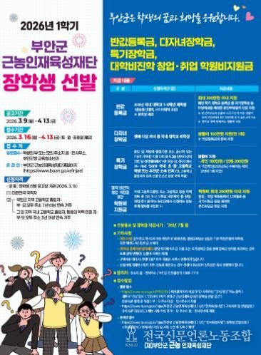 전국신문언론노동조합 강찬희 기자 | 부안군 근농인재육성재단은 2026년 1학기 장학생 신청 접수를 위해 각종 홍보자료를 준비하고 온라인 신청 시스템을 정비하는 등 장학생 선발 준비를 모두 마쳤다고 전했다.