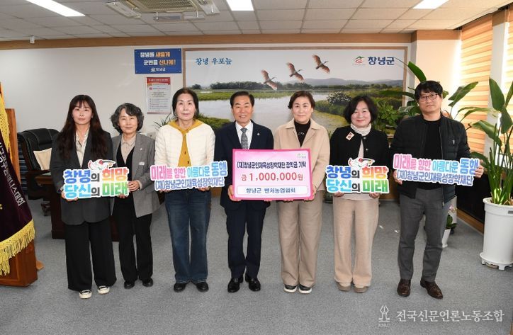 전국신문언론노동조합 강찬희 기자 | 창녕군은 10일 창녕군벤처농업인협의회(회장 오명주)가 지역 인재 육성을 위해 (재)창녕군인재육성장학재단(이사장 성낙인 창녕군수)에 장학금 100만 원을 기탁했다고 밝혔다.