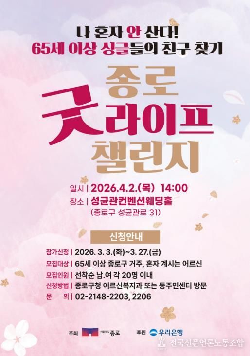 전국신문언론노동조합 강찬희 기자 | 종로구는 홀로 지내는 어르신들에게 새로운 만남의 기회를 제공하고 활기찬 노년을 응원하기 위해 '2026년 상반기 종로 굿라이프 챌린지'를 개최한다.