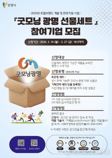 모집 대상은 선물세트 제작이 가능한 제품을 보유한 광명시 소재 중소기업, 사회적경제기업, 소상공인 등이다. 광명에서 생산·제조한 생활용품, 식품, 공예품 등 특판이 가능한 전 품목이 해당하며, 선정된 제품은 ‘굿모닝광명’ 브랜드 로고와 전용 패키지를 입혀 세련된 세트 상품으로 재탄생한다.