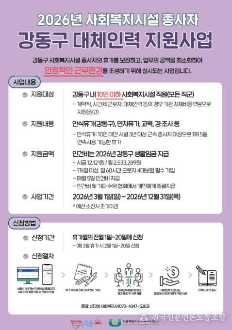 전국신문언론노동조합 강찬희 기자 | 서울 강동구는 소규모 사회복지시설의 업무 공백을 줄이고 종사자의 휴식권을 보장하기 위해 ‘사회복지시설 종사자 대체인력 지원사업’을 추진한다고 밝혔다.