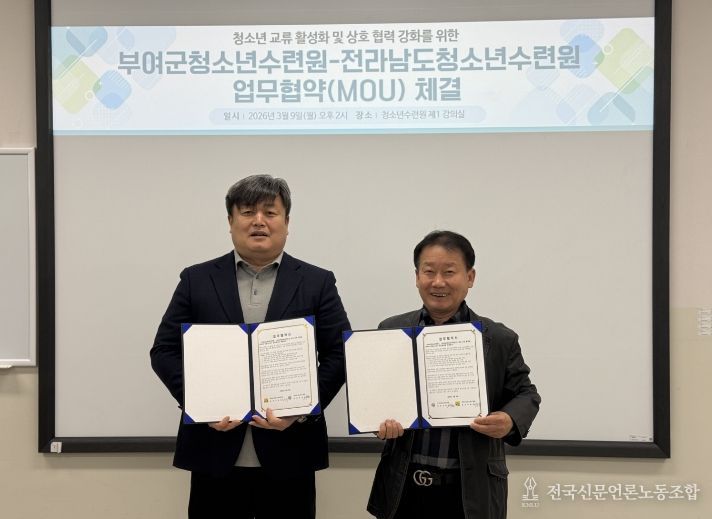 전국신문언론노동조합 강찬희 기자 | 전라남도청소년수련원(원장 이춘복)은 부여군청소년수련원과 상호 교류 및 협력 강화를 위한 업무협약(MOU)을 체결했다고 밝혔다.