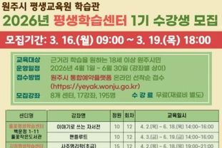 20세 이상 원주 시민이라면 누구나 수강할 수 있다. 참여 신청은 3월 16일 오전 9시부터 원주시 통합예약플랫폼을 통해 선착순으로 접수한다.