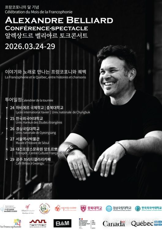 전국신문언론노동조합 강찬희 기자 | 경상국립대학교 인문대학 불어불문학과는 3월 26일 오후 4시 인문대학 대강의실에서 캐나다 퀘벡 출신 예술가 알렉상드르 벨리아르(Alexandre Belliard)를 초청해 프랑스어권 아메리카의 역사와 문화를 주제로 한 토크콘서트를 개최한다.