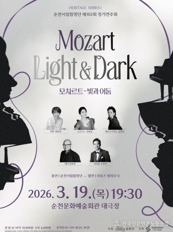 전국신문언론노동조합 강찬희 기자 | 순천시는 오는 19일 저녁 7시 30분, 순천문화예술회관 대극장에서 순천시립합창단 제102회 정기연주회 ‘모차르트의 빛과 어둠’을 개최한다고 밝혔다.