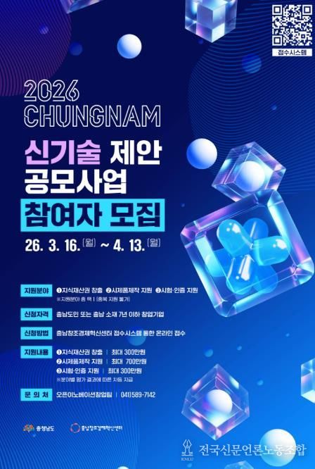 전국신문언론노동조합 강찬희 기자 | (재)충남창조경제혁신센터는 도민과 도내 창업기업이 보유한 신기술 아이디어의 상용화를 지원하는 ‘2026년 충남 신기술 제안공모 사업’ 참여자를 4월 13일까지 모집한다고 밝혔다.