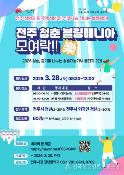 시는 오는 28일 오전 9시 30분, 전주지역 청년과 전주에서 거주하는 외국인 청년 등 60여 명이 함께하는 ‘청춘 볼링매니아 모여락(樂)!’ 행사를 개최한다.