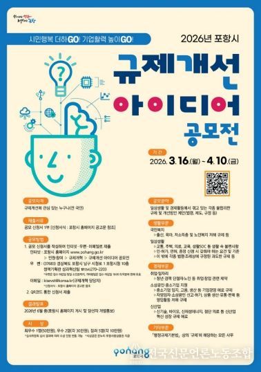 전국신문언론노동조합 강찬희 기자 | 포항시는 일상생활과 경제활동에 불편을 주는 불합리한 규제를 시민과 함께 발굴하고 개선하기 위해 3월 16일부터 4월 10일까지 ‘2026년 포항시 규제개선 아이디어 공모전’을 개최한다.