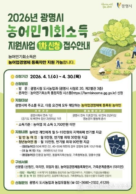 전국신문언론노동조합 김성길 기자 | 광명시는 오는 4월 1일부터 4월 30일까지 ‘농어민 기회소득 지원사업 1차’ 신청을 받는다.