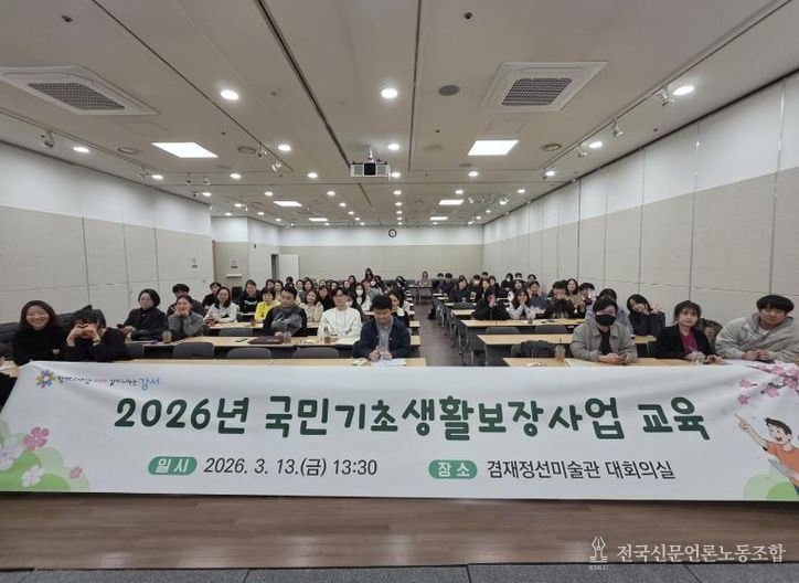 전국신문언론노동조합 강찬희 기자 | 서울 강서구는 지난 13일 겸재정선미술관에서 신규 임용 사회복지직 공무원과 주민센터 복지 담당자 등 70명을 대상으로 ‘2026년 국민기초생활보장사업’ 교육을 실시했다.