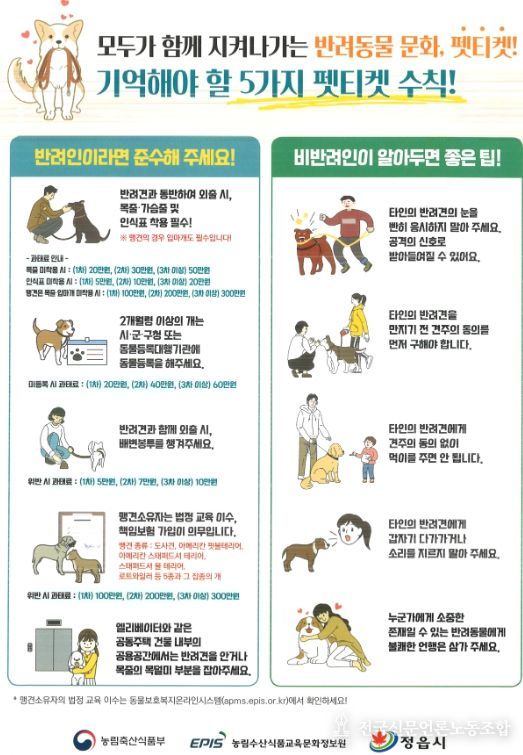 전국신문언론노동조합 강찬희 기자 | 정읍시가 봄철 나들이 시즌을 맞아 반려인과 비반려인 간의 갈등을 예방하고 성숙한 반려동물 문화를 조성하기 위해 23개 읍·면·동 전역에 ‘펫티켓’ 홍보물 배부에 나선다.