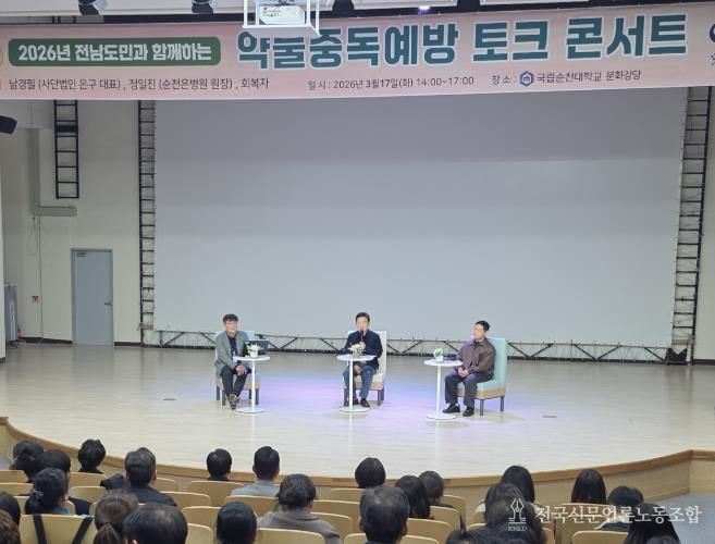 전국신문언론노동조합 강찬희 기자 | 전라남도와 한국마약퇴치운동본부 전남함께한걸음센터는 약물중독예방 토크콘서트를 지난 17일 국립순천대학교에서 열고 마약 중독의 위험성과 회복 지원 방안을 논의했다.