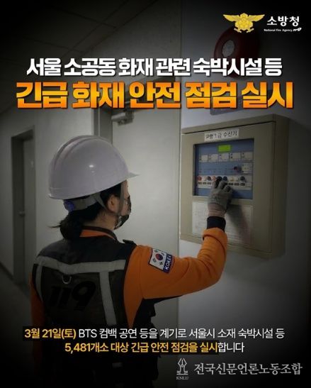 3월 21일(토) BTS 컴백 공연 등을 계기로 서울시 소재 숙박시설 등 5481개소 대상 긴급 안전점검을 실시합니다.