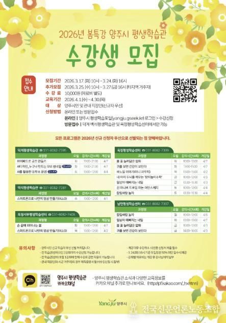 전국신문언론노동조합 김성길 기자 | 양주시가 시민들의 자기계발과 여가 활용을 돕고자 ‘2026년 봄 특강’수강생을 모집한다.