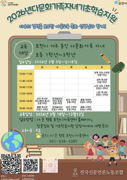 전국신문언론노동조합 김성길 기자 | 포천시 더 큰 행복 포천시가족센터는 다문화가족 자녀의 안정적인 학교생활 적응과 학습 격차 해소를 위해 ‘다문화가족 자녀 기초학습지원 사업’을 18일부터 본격 운영한다.