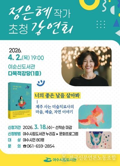 전국신문언론노동조합 강찬희 기자 | 여수시는 오는 4월 2일 오후 7시 이순신도서관 다목적강당에서 정은혜 작가를 초청해 강연회를 개최한다고 밝혔다.