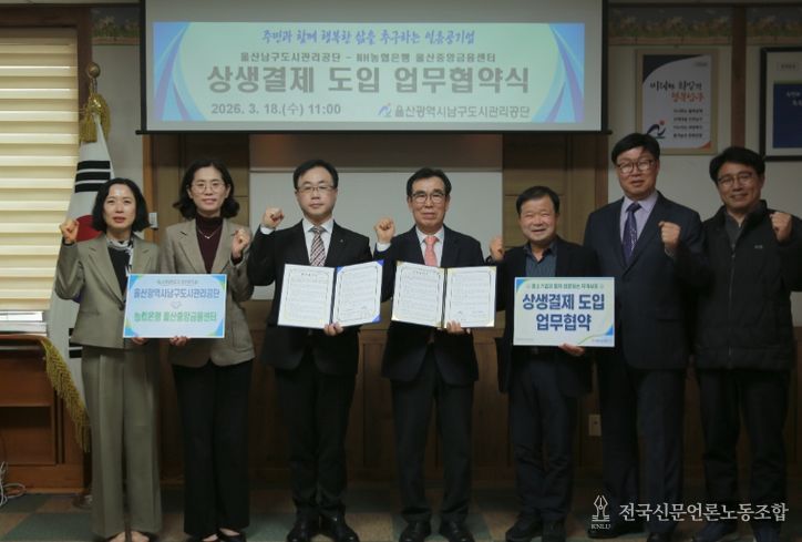 전국신문언론노동조합 강찬희 기자 | 울산남구도시관리공단은 18일 농협은행 울산중앙금융센터와 중소기업 상생환경 조성을 위해 상생결제 시스템 도입과 확산을 위한 업무협약을 체결했다.