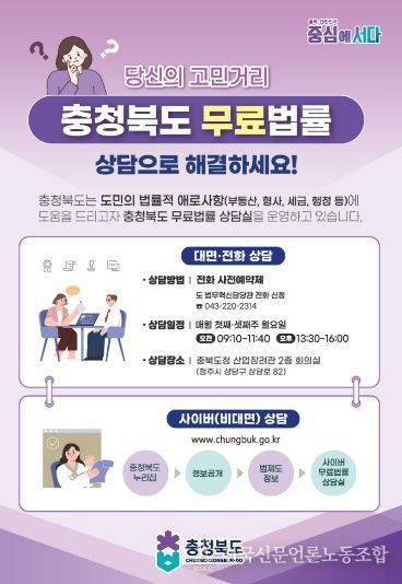 전국신문언론노동조합 김성길 기자 | 충북도가 3월 19일 보은군을 시작으로, 올해 상반기 도내 3개 시군 현장에서 도민의 법적 애로사항을 듣는 ‘찾아가는 무료법률상담실’을 운영한다.