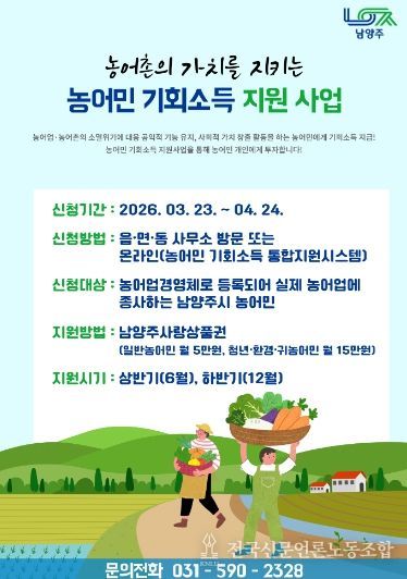 전국신문언론노동조합 김성길 기자 | 남양주시는 오는 23일부터 ‘2026년 농어민 기회소득 지원사업’을 신청받는다고 18일 밝혔다.