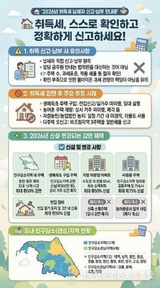 전국신문언론노동조합 강찬희 기자 | 평화 경제 거점 도시 강원 고성군은 취득세 감면 요건 복잡화로 인한 납세자의 불이익을 예방하고 세정 신뢰도를 높이기 위해 ‘취득세 신고·납부 안내 강화 추진 계획’을 시행한다.