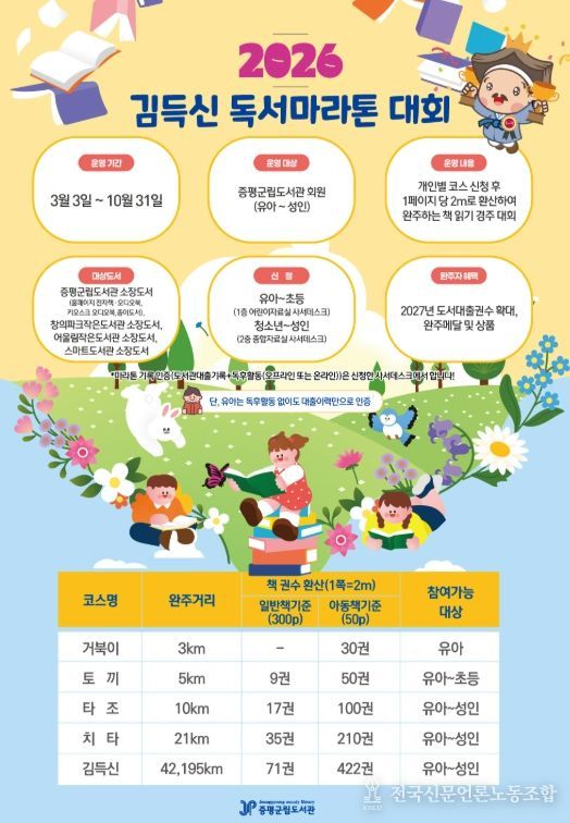 전국신문언론노동조합 김성길 기자 | 충북 증평군립도서관이 책 읽는 문화 확산을 위해 ‘김득신 독서마라톤’ 대회를 이달부터 10월까지 운영한다고 19일 밝혔다.