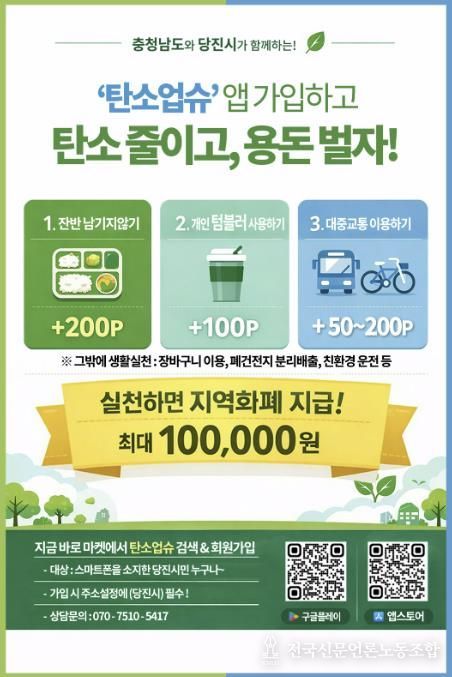 전국신문언론노동조합 강찬희 기자 | 당진시는 기후위기 대응을 강화하고 시민들의 자발적인 탄소중립 실천을 확산하기 위해 충남형 탄소중립포인트제 ‘탄소업슈’ 가입자 확대를 본격 추진한다고 19일 밝혔다.