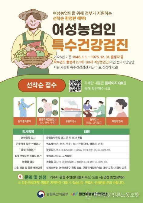 군은 오는 4월 10일까지 관내 거주하는 만 51~80세(1946년 1월 1일~1975년 12월 31일) 사이의 짝수 연도 출생 여성농업인 530여 명을 대상으로 건강검진 지원 신청을 주소지 읍·면 행정복지센터를 통해 접수하고 있다.