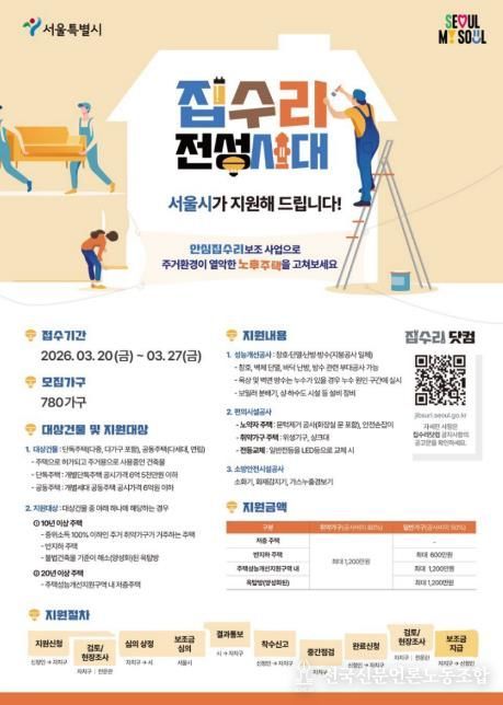 전국신문언론노동조합 강찬희 기자 | 중랑구가 3월 20일부터 27일까지 '2026 안심집수리 보조사업' 신청자를 모집한다. 주민 주거환경 개선과 에너지 성능 향상을 통한 온실가스 배출 저감을 위한 사업이다.