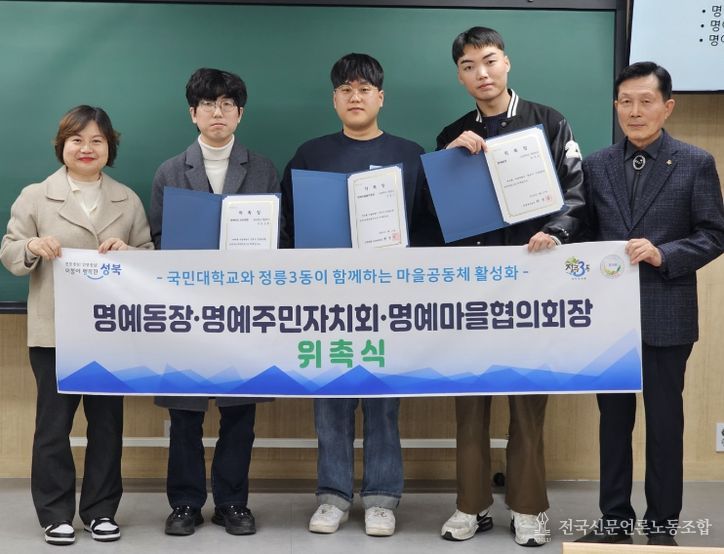 전국신문언론노동조합 강찬희 기자 | 서울 성북구 정릉3동주민센터가 지난 3월 17일 사랑교회에서 제9기 명예단체장 위촉식을 열고 국민대학교 학생 3명을 명예동장, 명예주민자치회장, 명예마을협의회장으로 각각 위촉했다.