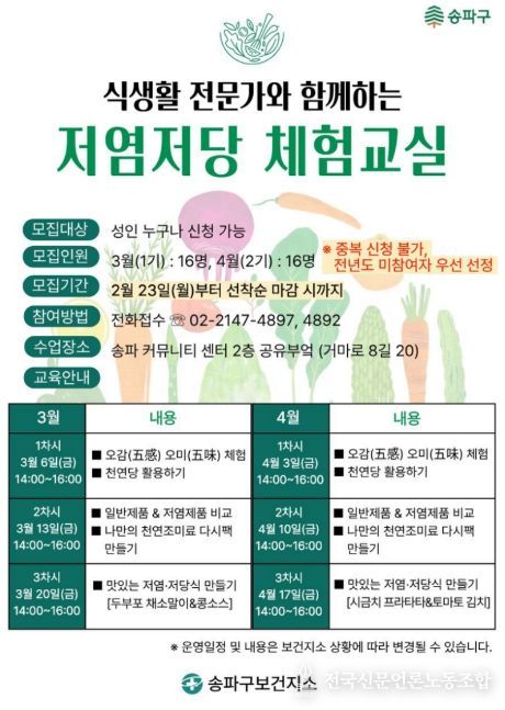 이 같은 건강 문제에 대응하기 위해 서울 송파구(구청장 서강석)는 주민 참여형 영양교육 프로그램인 ‘저염·저당 건강밥상 체험교실’을 운영하고 있다.