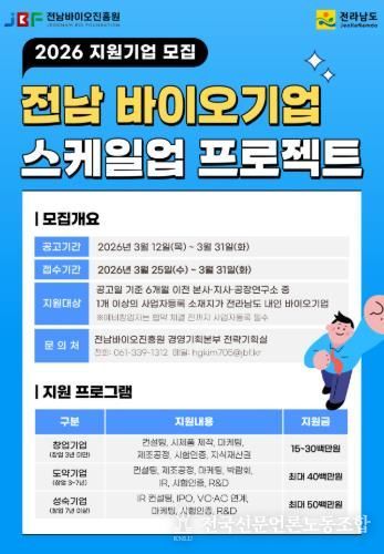 전국신문언론노동조합 강찬희 기자 | 전라남도가 2026년 신규사업으로 ‘전남 바이오기업 스케일업 프로젝트’를 본격 가동하고, 참여기업 모집에 나섰다.
