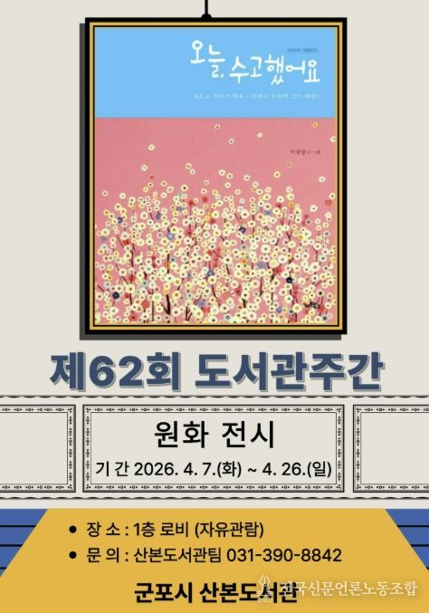 전국신문언론노동조합 김성길 기자 | 군포시 산본도서관은 도서관주간을 맞아 시민들의 독서문화 확산과 책을 통한 공감의 시간을 마련하기 위해 작가와의 만남, 북토크, 원화전시 등 다양한 프로그램을 운영한다.